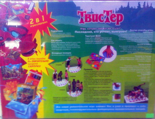 Вложение 2227 Настольная игра Супер-Твистер. Можно играть от 2-х игроков до большой команды. В зависимости от количества играющих можно выбрать правила игры .В ходе игры участники перемещают свои руки и ноги на кружки того цвета,на который указывает стрелка рулетки . Если игрок потерял равновесие и коснулся локтем или коленом коврика или упал- он выбывает из игры. Последний игрок, который остался "стоящим" после того, как все участники выбыли из игры. является победителем. В комплекте еще поле для "Мини-Твистера"- в нем игроки тренируют свои пальчики. Очень веселая командная игра,которая подходит как для детей, так и для взрослых. Игра учит сосредоточенности, улучшает координацию движений . Помогает замечательно провести время и дарит хорошее настроение. В наборе: Игровое поле 180х120 см, игровая рулетка со стрелкой- 1 шт., игровое поле "Мини-Твистер"- 1 шт.,игровая планшетка "Мини Твистер" со стрелкой - 1 шт.,коробка- 1 шт. Возраст: 6+ 20$ Производство: СПД Остапенко , г.Львов, Украина. |