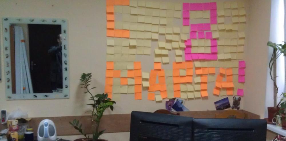 Праздничное оригинальное оформление рабочего места девушки на 8 марта, обклеили стенку стикерами. Шарики на потолке. Сюрприз!