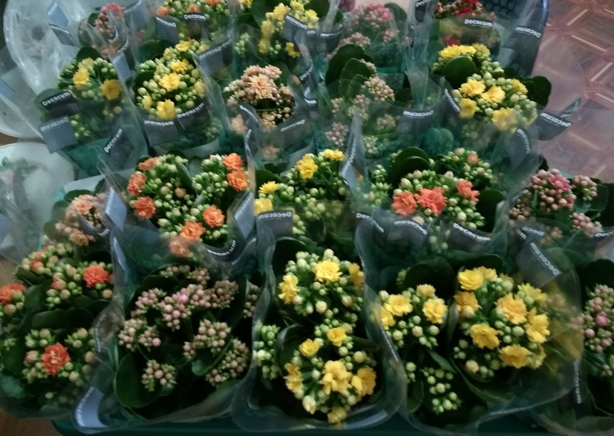 Каланхое) Люблю этот цветок тоже, все цвета как на картинке дома есть) А вообще идея хорошая, те же срезанные цветы и недели не простоят, а горшечные будут долго радовать и напоминать о празднике)))