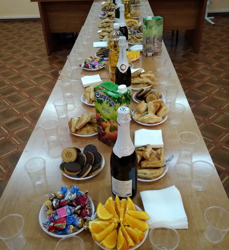 А вот наше застолье на корпоративе на 8 марта. Небольшой фуршетик, зато приятно.