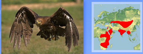 Ареал: Европа, Северная и Западная Африка, Азия. Питание: мелкие млекопитающие (зайцы,суслики). Социальная жизнь: держится парами или в одиночку. Размеры тела, вес: длина 72 - 84см, размах крыльев 2 м, вес 2,5 - 4,5кг. Активность: дневной хищник. Половозрелость: в 4 года. Сезон размножения: апрель. Яйцекладка: 2, редко 3 яйца. Время насиживания: 43 дня, насиживают оба родителя. Населяет лесостепи, участки древесной растительности в степи, полупустыни и местами даже пустыни. Встречается на равнинах и в нижнем поясе гор. Гнезда расположены на деревьях, редко по обрывам. В европейских странах могильника называют императорским или королевским орлом, хотя он и не самый крупный среди настоящих орлов высшего ранга. |