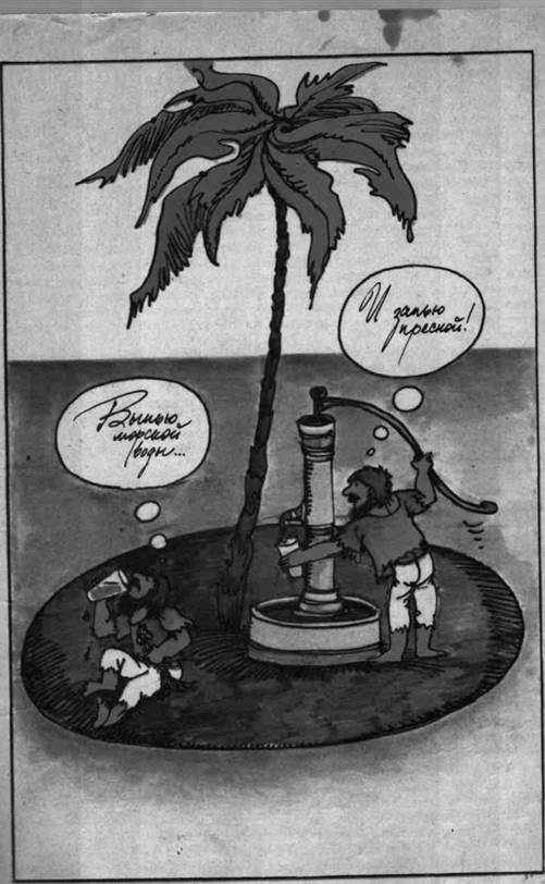 А известно ли тебе, почему ни одно живое существо на свете и не подумает отправиться на берег моря, чтобы утолить жажду? Или почему люди, попавшие в беду посреди безбрежных просторов океана, погибают от жажды? Потому, что морская вода не пригодна для питья — она слишком соленая. Человеческий организм не переносит большого количества соли, поскольку соль и вода в нем находятся в определенном строгом равновесии. От лишних солей тело должно быстро освобождаться. Эту работу в основном проделывают почки. С морской же водой в организм попадает такое количество соли, что для выведения ее нужно выпить гораздо больше пресной воды, чем человек выпил морской. Поэтому морской водой и невозможно утолить жажду. Вот если морскую воду запивать пресной водой, тогда все было бы в порядке.