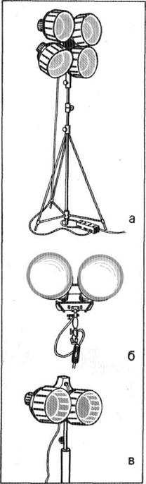 В этом случае на фотографии получается светлая (бликующая) полоса по контуру объекта. Этот свет эффективен при съемке портретов (где может быть получен ореол светящихся волос), натюрморта, скульптуры. Контровой свет направлен прямо навстречу фотоаппарату или несколько в сторону от него. При этом необходимо следить за тем, чтобы прямые лучи света не попадали в объектив, для чего применяется бленда [3]. Для контрового света зачастую используются осветительные приборы с тубусом небольшого диаметра. При разработке и вычерчивании схем искусственного или естественного освещения целесообразно воспользоваться основными условными обозначениями, указанными на рис. 4.14. Вложение 1812 Рис. 4.14. Условные обозначения в схемах освещения: 1 — фотоаппарат; 2 — объект съемки; 3 — осветительный прибор направленного света; 4 — осветительный прибор рассеянного света; 5 — осветительный прибор с сеткой или светофильтром; 6 — рассеиватель из материала (тюля); 7 — отражающая подсветка; 8 — тубус на осветительном приборе для уменьшения диаметра светового потока; 9 — заслонки, установленные на осветительном приборе; 10 — импульсный осветитель; 11 - окно комнаты с направлением света Осветительные приборы. При создании необходимого освещения объекта съемки источники света располагаются согласно определенной схеме. Для удобства в пользовании, мобильности их установки и регулирования величины освещенности промышленностью выпускаются специальные осветительные приборы направленного, рассеянного света. Вложение 1813 Рис. 4.16. Осветительные приборы рассеянного света с зеркальными лампами: в — ОПЗ4 (осветительный прибор зеркальный с четырьмя отражателями); в — 0ПЗ2б — ПНСБ |