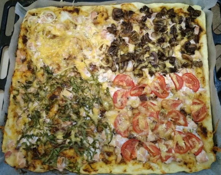 Очень вкусная пицца, называется - "времена года". Пошаговая инструкция есть в нете, а в итоге получается вот такая красота!