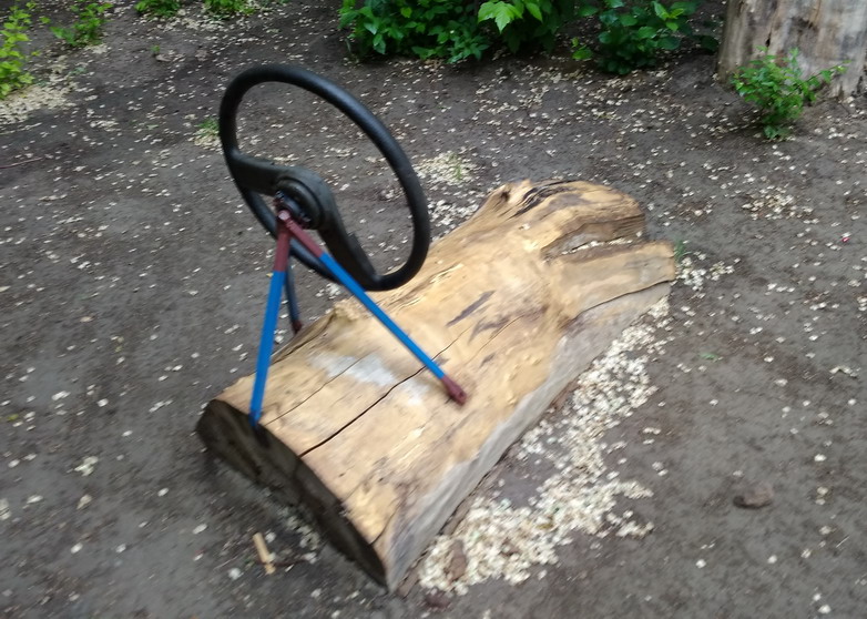 А вот оригинальная идея - использовать старый спил дерева и руль от авто для постройки машинки.