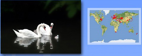 Ареал: Австралия, Тасмания, Новая Зеландия. Питание: водные растения, водоросли, зерно и прибрежные травы. Социальная жизнь: образуют постоянные пары, гнездятся в колониях. Размеры тела, вес: рост 110 -140 см, вес 4 - 8 кг. Активность: дневной образ жизни. Половозрелость: в 2,5 - 3 года. Сезон размножения: январь - февраль. Яйцекладка: 4-8 зеленоватых яйца. Время насиживания: 38 - 42 дней, насиживают оба. Продолжительность жизни: в природе до 40 лет. В отличие от многих водных птиц и других видов лебедей, черный лебедь не является перелетной птицей. Тем не менее, он очень мобильный и даже относительно небольшие помехи, такие как продолжительный шум, могут подвигнуть его на перемену места пребывания. |