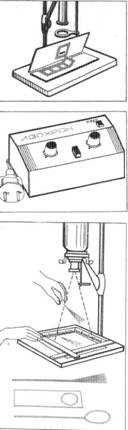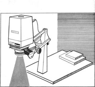 Это является крупноформатным увеличением, экспозиция при котором осуществляется на пол или стену. При проецировании изображения на пол проектор увеличителя поворачивается на 180° (рис. 7.27), в качестве противовеса на стол-экран укладывается груз (стопка книг, специально изготовленный металлический брусок и т. п.). При проецировании изображения на стену проектор увеличителя поворачивается в горизонтальной плоскости на 90° (рис. 7.28) и прочно фиксируется винтом в этом положении. Масштаб изображения зависит от расстояния увеличителя до стены. Как при экспонировании изображения на пол, так и на стену используется экран больших размеров — чертежная доска, дверь, лист фанеры и другой подобный материал. Для улучшения качества наведения резкости на экран прикрепляется белый лист бумаги, затем проецируется изображение, отмечаются границы кадра, по которым укрепляется лист фотобумаги. Экспонирование осуществляется включением лампы проектора проходным выключателем. Наиболее удобно при крупноформатном увеличении пользоваться электронным реле времени. Вложение 1838 Рис. 7.27. Установка увеличителя для проецирования на пол Вложение 1839 Рис. 7.28. Установка увеличителя для проецирования на стену |