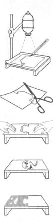 Можно использовать и такой прием. Не выключая лампу увеличителя, под светофильтром положить в кадрирующую рамку фотобумагу. Перекрыть ладонью свет под светофильтром, открыть его, дать экспозицию, опять перекрыть ладонью свет и закрыть красный светофильтр. Экспонирование можно вести при помощи электронного реле, которое подключается к фотоувеличителю (рис. 7.23). Промышленностью выпускаются различные типы реле. Суть их работы заключается в полуавтоматическом отсчете величины выдержки при фотопечати. Использование реле времени обеспечивает возможность получения большого количества одинаковых по технике печати фотографий. Особенно удобно такое реле в тех случаях, когда печатаются 3—5 и более фотографий с одного негатива, с плотных негативов и в некоторых других случаях. Затемняющие приспособления или заслонки для регулирования внутрикадровой выдержки позволяют правильно устанавливать величину освещенности отдельных участков кадра. Заслонки могут быть различной формы, конфигурации (рис. 7.24), изготавливаться из картона, черной плотной бумаги и других непрозрачных легких материалов. Заслонки крепятся на тонких проволочках. При фотопечати они располагаются между объективом и фотобумагой, а экспонирование ведется при постоянном незначительном их движении, что делает незаметными границы затемнения на фотографии. Если же заслонку закрепить неподвижно, на отпечатке останется светлый (или более светлый) участок, повторяющий ее конфигурацию. |