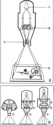 Вложение 1843 Рис. 7.1. 0 — Схема проекционной печати с негативов: 1 — лампа; 2 — негативное изображение на прозрачной основе; 3 — линза (система линз); 4 — увеличенное изображение на экране; б — Схемы освещения негатива в фотоувеличителях разных конструкций: О — объектив, Н — негатив, М — матовое стекло, К — конденсор Вложение 1844 Рис. 7.2. Фотоувеличитель. Принципиальная схема: 1 — осветитель; 2 — электрическая лампа; 3 — конденсор; 4 — рамка для негативов; 5 — устройство для наводки на резкость; 6 — объектив; 7 — светофильтр для создания неактиничного освещения фотобумаги; 8 — экран (проекционный стол); 9 — стойка |