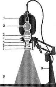 В зависимости от избранной фотолюбителем схемы организации фотолаборатории осуществляется подготовка его рабочего места для печати фотографий (см. параграф 5.2). Основным элементом оборудования для фотопечати является фотоувеличитель. Принципиальная схема проекционной печати фотографий довольно проста и состоит из следующих элементов (рис. 7.1): источника света 1; негатива 2; линзы 3; увеличенного изображения 4. В соответствии с данной схемой сконструированы почти все современные фотоувеличители (рис. 7.2). Вертикальное расположение оптической схемы предполагает обязательное наличие светозащитного колпакаосветителя 1, проекционной лампы 2, конденсора 3, рамки для негативов 4, устройства наводки на резкость 5, объектива 6, красного (оранжевого) светофильтра 7, экрана (проекционного стола) 8, стойки (кронштейна) 9.
