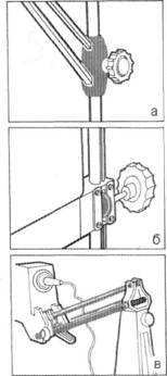 К проекционному столу (экрану) крепится стойка, которая, в свою очередь, служит основанием для проектора фотоувеличителя. Конструкция стойки, в том числе узла подвески проектора, выполнена у разных типов увеличителей по-разному. Самой простой конструкцией считается подвеска на скользящей стяжной муфте (рис. 7.3,а). В процессе работы муфта, однако, не позволяет плавче перемещать проектор увеличителя. Ликвидации данного недостатка способствует система фрикционной подвески (рис. 7.3,6), которая обеспечивает плавное, без усилий перемещение проектора одной рукой при установке нужного формата фотографии. Наиболее удобной конструкцией подвески считается устройство на качающихся тягах (рис. 7.3,в). Оно позволяет очень быстро и легко изменять масштаб изображения, кадрировать при печати. Вложение 1845 Рис. 7.3. Наиболее распространенные системы подвески фотоувеличителей: а — скользящая стяжная муфта; б — фрикцион; е — система на качающихся тягах |
