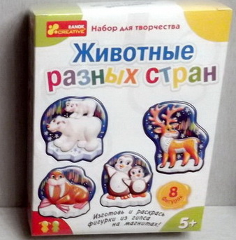 Набор для творчества Животные разных стран. Сделано из гипса для Вашего ребенка.Гипс на магнитах, набор из 8 фигурок. Изготовь и расскрась фигурки из гипса на магнитах. Для детей от 5 лет. Работа с гипсом — это всегда увлекательное занятие для ребенка, ведь он чувствует себя настоящим творцом. А раскрасив полученные изделия красками из набора, ребенок становится еще и художником. Но и это еще не все! Прикрепляем магниты из набора — и яркая поделка становится настоящим подарком для друзей и близких. Красивые, объемные гипсовые фигурки-магнитики станут отличным украшением любого уголка вашего дома, а ребенку подарят ни с чем не сравнимую радость творчества. В комплекте: 2 формы для отливания гипса, гипс, акриловые краски (6 цветов), кисть, магнитная лента, инструкция. 9$.