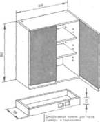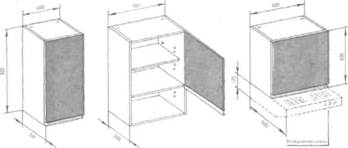 Навесные шкафы (стандартная глубина 300 мм, высота 900 мм) располагают на высоте 450—650 мм от рабочей плоскости напольного оборудования. От верха до потолка оставляют не менее 100 мм — для удобства навески и уборки; верхняя линия шкафов и линия оконного карниза должны быть зрительно увязаны. Мебель для К. отделывают синтетическими пленками, белой или цветными эмалями, бумажно-слоистым пластиком с рисунком под мрамор, текстуру дерева, ткань и др., позволяющими проводить влажную уборку. Шкафы комплектуются пластмассовыми или стеклянными емкостями для хранения сыпучих продуктов, переставными полками, подставками для сушки посуды решетчатыми ящиками для хранения овощей, ведром для мусора.