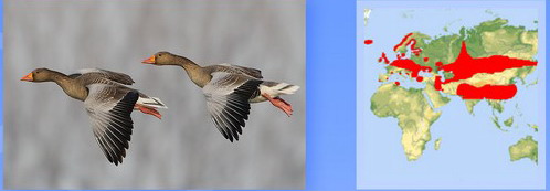 Ареал: Сев. и Центр. Европа, умеренный пояс Азии. Зимует в Юж. Европе и Азии, иногда в Сев. Африке. Питание: трава, злаковые, ягоды, водные растения. Социальная жизнь: гнездятся колониями, образуют пары. Размеры тела, вес: длина 70 - 90 см, вес около 3,5 кг, самец крупнее самки. Активность: дневной образ жизни. Половозрелость: 3-4 год жизни. Сезон размножения: конец марта - апрель. Яйцекладка: 4-12 яиц. Время насиживания: 28 - 29 дней, насиживает самка. Продолжительность жизни: в природе около 20 лет, в неволе до 50 лет. Серый гусь населяет водоёмы со стоячей водой, окружённые тростниками - болота, озёра, рыборазделочные пруды. Встречается он и на травянистых болотах и заливных лугах, выбирая самые недоступные места. |