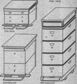 Улей пчелиный, жилище для пчелиной семьи, основной инвентарь пасеки, защищающий пчелиную семью от холода и перегрева, сохраняя внутри гнезда необходимый микроклимат. П. плохо переносят повышенную влажность, поэтому в ульях в любое время года еле 1ч поддерживать хорошую вентиляцию без сквозняков. Многокорпусный улей, наиболее современный, создает благоприятные условия для пчелиной семьи, удобен в работе пчеловода. Пчелиная семья в нем развивается вертикально, сии 1 вверх, мобилизуя энергию на заполнение очередного корпуса, который надставляется поверх полностью заселенного корпуса. Постоянное наблюдение за развитием семьи позволяет пчеловоду легко и своевременно расширять гнездо, обеспечивая простор для накопления запасов меда, выращивания расплода. Использование улья такого типа дает возможность предотвращать роение и выращивать сильные семьи, что обеспечивает высокий медосбор. Двухкорпусный улей состоит из двух одинаковых корпусов. Как правило, нижний корпус заполнен расплодом, а верхний — медом. В у л ь е -лежаке одновременно с основной семьей можно содержать 1—2 нуклеуса (маленький улей для отводка), которые весной используются для наращивания пчел к раннему взятку. |