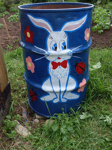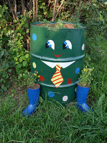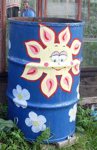 А вот украшение дачи. Бидоны, бочки и баки с рисунками в огороде и в саду. Да и еще всякие интересные предметы превращаются в клумбы с цветами.