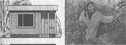 Теплица — помещение с покрытием из светопрозрчного материала, предназначенное для выращивания рассады и теплолюбивых культур. В отличие от парника температура и влажность воздуха в Т. поддерживаются относительно постоянными с помощью обогрева и вентиляции. Т. подразделяют на грунтовые (культуры высаживают в грунт) и стеллажные (растения выращивают в грунте, насыпанном на полках). Т. бывают односкатные, двухскатные и блочные. В личных подсобных хозяйствах МССР распространены двухскатные Т., для которых в качестве покрытия используют, как правило, полиэтиленовую пленку. Т. располагают на ровном участке или с небольшим уклоном на юг таким образом, чтобы светопрозрачные плоскости были направлены на восток и на запад. Каркас Т., изготовленный из реек 3X5 (или 4X6) см, устанавливают на цоколь из кирпича, бетона или бревен. Удобны Т. с замкнутой циркуляцией воздуха, в которых устанавливается электрический вентилятор. Он забирает воздух из помещения, прогоняет его по заложенным в грунт трубам, после чего воздух возвращается в помещение. Нагретый солнцем воздух, проходя днем по трубам, отдает тепло грунту и возвращается в Т. охлажденным. Ночью накопленное в почве тепло согревает воздух в Т. Замкнутая циркуляция воздуха обеспечивает поддержание оптимальной температуры. Грядки делают, как правило, насыпными (высотой 40—45 см и шириной 100—125 см); там, где грунтовые воды залегают глубоко, можно не насыпать гряд. Вокруг Т. следует прокопать канавки для стока ливневых и талых вод. |