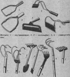 Вилы. Легко входят в почву и глубоко рыхлят ее, не перерезая корней растений. Мотыги служат для рыхления почвы с одновременным уничтожением сорняков в период вегетации, а также для окучивания растений.
