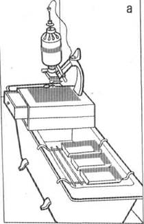 Оборудование для фотопечати размещается на столе, размеры которого могут быть в минимальном варианте 50 X100 см. Поверхность стола закрывается любым водонепроницаемым материалом: пластиком, оргстеклом, стеклом и т. п. С целью соблюдения гигиены на поверхность пластика кладется лист чистой белой бумаги. Слева устанавливается фотоувеличитель, справа от него — три кюветы (слева направо): с проявителем, водой, закрепителем. В том случае когда в процессе фотопечати используется стоп-раствор, кювету с ним ставят четвертой. Каждая кювета постоянно используется для одного и того же раствора, и на ней можно изобразить, например, П — проявитель, Ф — фиксаж, В — вода, С — стоп-раствор. Конструкция лабораторного стола для фоторабот может быть самой разнообразной, учитывающей возможности рационального расположения необходимого оборудования. |