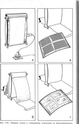 После лабораторно-химической обработки фотографии подвергаются сушке. При самом простом способе сушки отпечатки раскладывают эмульсией вверх на листах газетной бумаги и в течение нескольких часов высушивают. Однако в этом случае все отпечатки скручиваются, а фотографии, выполненные на глянцевой фотобумаге, не приобретают зеркального блеска. Существует много различных способов сушки и глянцевания отпечатков. Наиболее эффективный — с использованием фотоглянцевателя (рис. 7.30).