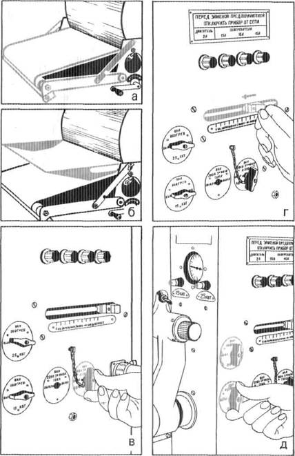 Ниже рассмотрен автоматический прибор АПСО5М, предназначенный для ускоренной сушки и глянцевания фотоотпечатков (рис. 7.32). За щитом электроуправления смонтированы электродвигатель и электроарматура. Щит электроуправления имеет переднюю и боковую панели. На передней панели располагаются две сигнальные лампы, по которым ведется наблюдение за работой обогревателей барабанов. Здесь же имеются шкала дистанционного термометра и таблица температур. На боковой панели щита электроуправления смонтированы: гнезда включения прибора в трехфазную сеть напряжением 380 В и гнездо включения в трехфазную сеть напряжением 220 В; рукоятки для включения обогревателей на 1,5 и 2,5 кВт; реостат для регулировки числа оборотов электродвигателя и соответственно скорости вращения зеркального барабана; 3 предохранителя на обогреватели по 15 А и 1 на электродвигатель на 2 А. Вложение 1823 Рис. 7.32. Автоматический прибор для сушки и глянцевания фотоотпечатков АПС05М |