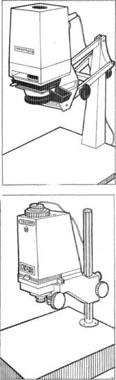 Рис. 7.6. Вкладыши негативной рамки для различного формата негативов Кратность увеличения изображения на экран (проекционный стол) — от 2,4 до 10 крат. Объектив типа И50У1 или объектив фотоаппарата с F=52 мм и резьбой М39Х1 Негативная рамка со щелевым устройством для наводки на резкость и комплектом вкладышей для кадров 24x36, 18x24, 13 X Х17 мм. Подвеска проектора — на качающихся тягах типа «Пантограф». Наводка на резкость — вращением винтовой оправы объектива. Источник света — электролампа мощностью 60—100 Вт и напряжением 127/220 В с прозрачной, матовой или молочной колбой. Имеется выдвижная рамка для корректирующих светофильтров, используемых при печати цветных фотографий. Размер светофильтров 90x90 мм. Вмещаемость рамки — одновременно 4 светофильтра. Вложение 1827 Рис. 7.12. Фотоувеличитель «Ленинград» Рис. 7.13. Фотоувеличитель «УПА609» |