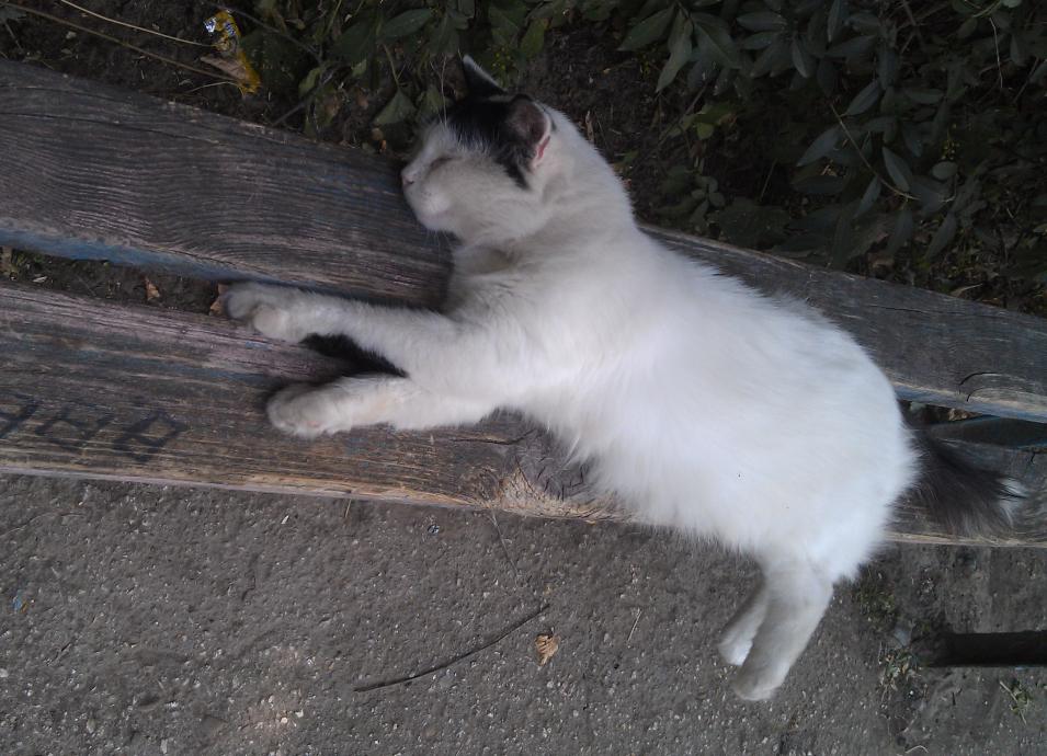 Кошка спит на скамейке.