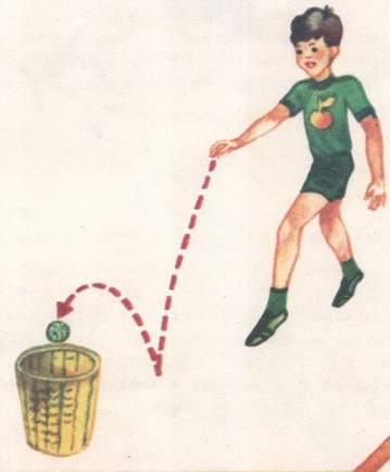 Мяч в корзину. В двух-трёх шагах от играющего на пол ставят корзинку, ведро или большую кастрюлю. Задача играющего — бросить мячик об пол так, чтобы он, отскочив, попал в корзинку. Упражнение повторяется несколько раз.