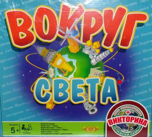 Викторина для всей семьи и географическое лото "Вокруг света". Комплектация: поля лото - 10 шт, карточки лото - 70 шт, карточки викторины - 54 шт, карта мира - 1 шт, инструкция на русском и украинском языке. Возраст детей: 5+ От 2 игроков.