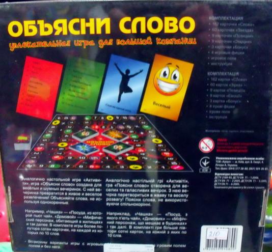 Комплектация: - игровое поле - правила игры - секундомер - 86 карточкек для игры - кубик Производитель - Ранок. 19$ Последний раз редактировалось Девушка; 14.09.2017 в 05:22 |