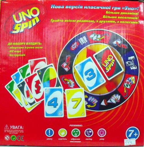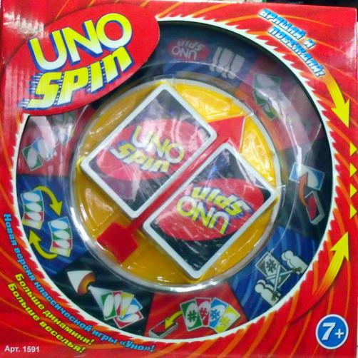 Uno Spin - новая версия классической игры Уно. Для развития памяти, внимания, образного мышления, логики, ума. Вращай и побеждай! Больше динамики и веселья! Играем всей семьей, с друзьями и колегами! В набор входят: - игровое поле - 112 карт - инструкция Для детей от 7 лет. 14$