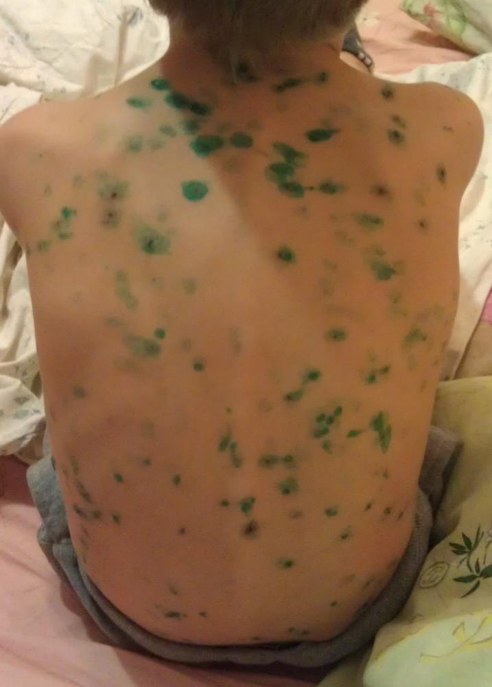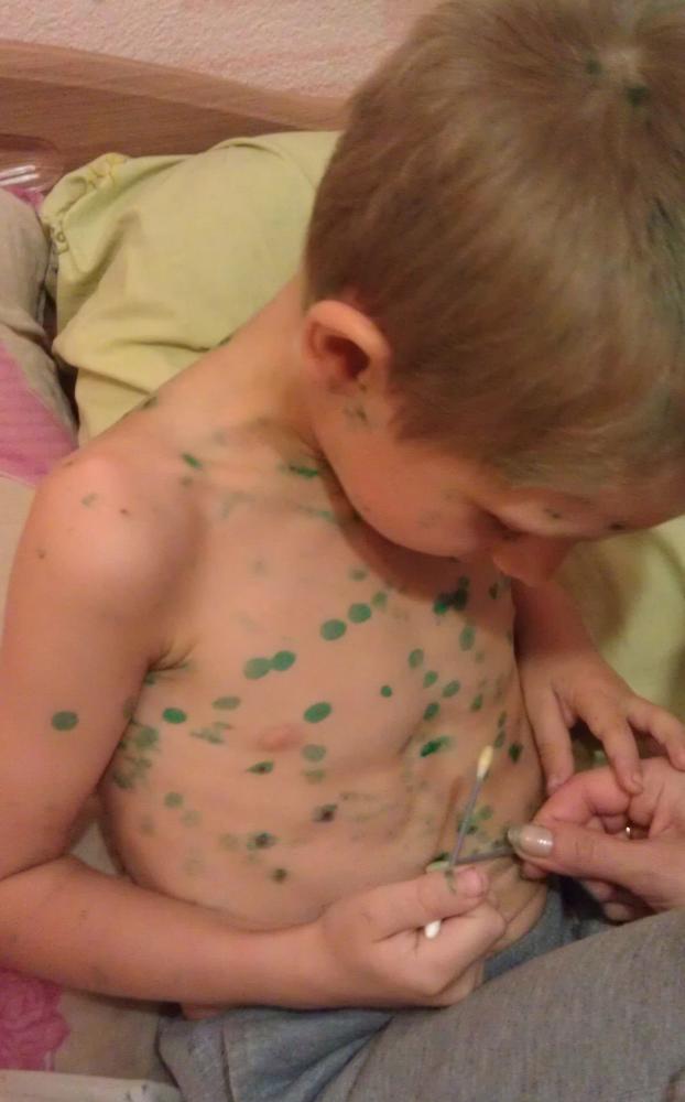 мы тоже все в крапинку были, такое впечатление, что он весь был зеленый,а чистого тела совсем не видно! сын просил, чтобы я ему еще и всякие машинки рисовала зеленкой, зверей и тд