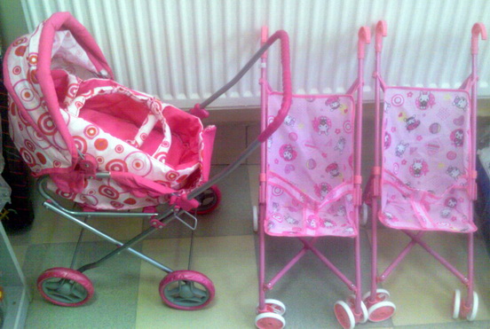 Коляски детские для девочек. Очень удобные модели колясок. Пусть ваша малышка почувствует себя будущей мамой. В детской коляске очень удобно катать куклы и любимые игрушки. Цены: 95 р. - маленькая коляска для кукол и 295 р. - большая коляска. 9$