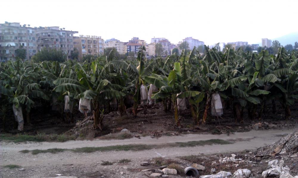 Горы в Алании - у подножия гор расположены банановые плантации, а рядом города, море.