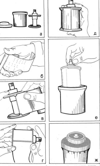 8. Опустить катушку с пленкой в корпус бачка (рис. 6.3,е).